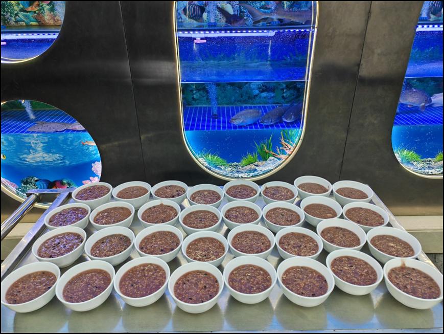当校园还沉浸在睡梦中时,餐饮后厨早已灯火通明,工作人员已经忙碌起来。优质的大米、饱满的红豆、香甜的红枣、圆润的桂圆等食材在大锅里翻滚,经过数小时的慢火熬煮,香气四溢。每一碗腊八粥都饱含着对师生们的关怀,希望能在这寒冷的冬日为大家驱散寒意。