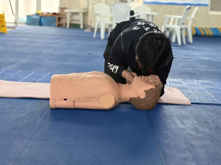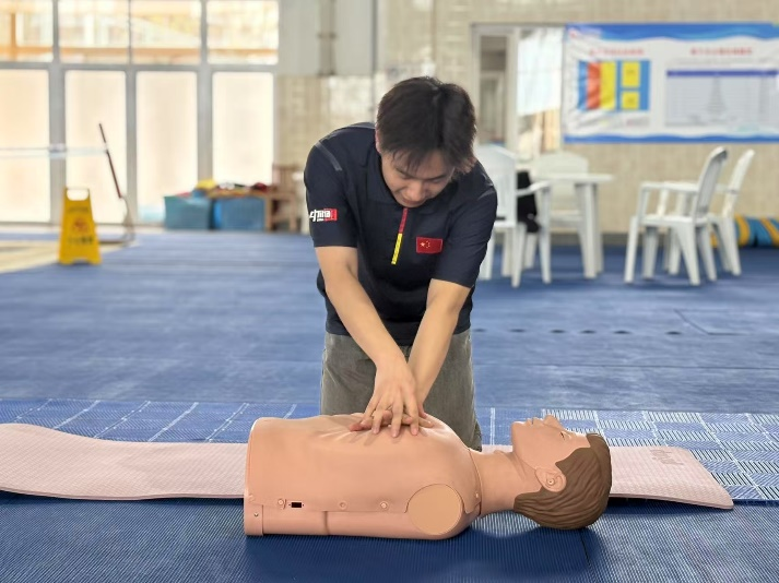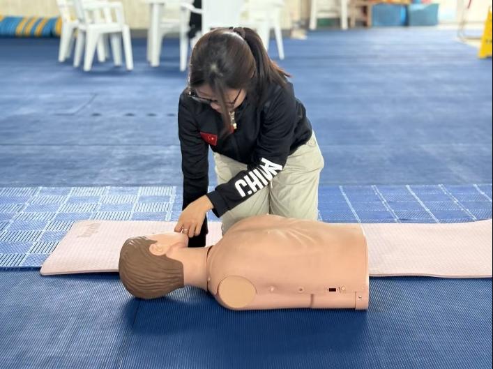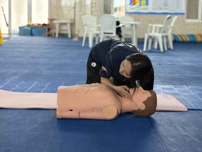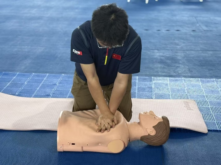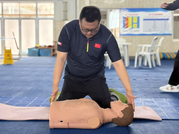 培训过程中,利用人体模型,分步骤详细演示了开放气道、人工呼吸等标准化急救流程,确保每位参训救护人员都能深刻理解并熟练掌握“黄金四分钟”救援的关键要素。此外,培训还设置了溺水救援专项模拟环节,参训人员依次进行环境评估、意识判断、胸外按压及AED除颤等全流程演练,以此提升实战能力。