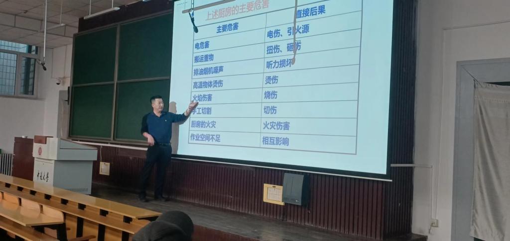 吴秉衡部长结合高校事故案例及后勤岗位工作的实际,讲解了消防安全的基本内容:四懂、四会、四个能力及灭火器、消火栓的使用方法、使用注意事项等。杨湖书记、陈建富副部长结合后勤工作的特点讲解了什么是危险源、危险源产生的原因及分类,危险源如何转化成事故,以厨房为例,讲解了什么是事故隐患,并例举常见的事故隐患会导致何种事故后果,及如何排查安全隐患的方法,讲解了如何进行安全目视化管理;能源与修缮中心主任白利波培训的内容是《用电用水用气安全》,结合校内外发生的因安全管理不当造成的电、水、气事故,介绍了事故的常见种类,讲解了导致事故发生的原因,学校在这些方面存在的问题与隐患,以及为防止事故的发生应该如何进行相应的安全管理;饮食服务中心李忠善副主任为饮食服务中心、物资采购中心全体人员讲解了在食品安全管理中如何养成食品安全意识及食品安全“五·四”制的内容等。