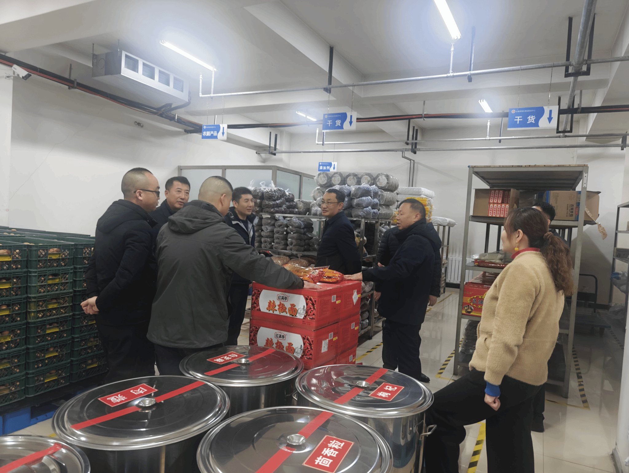 座谈结束后,调研团队实地参观了我校食堂,以及饮食物资采购快检室、冷冻库、主食库、副食库等配套库房。我校规范化的管理流程、整齐有序的物资存放,赢得了来访人员的高度认可。