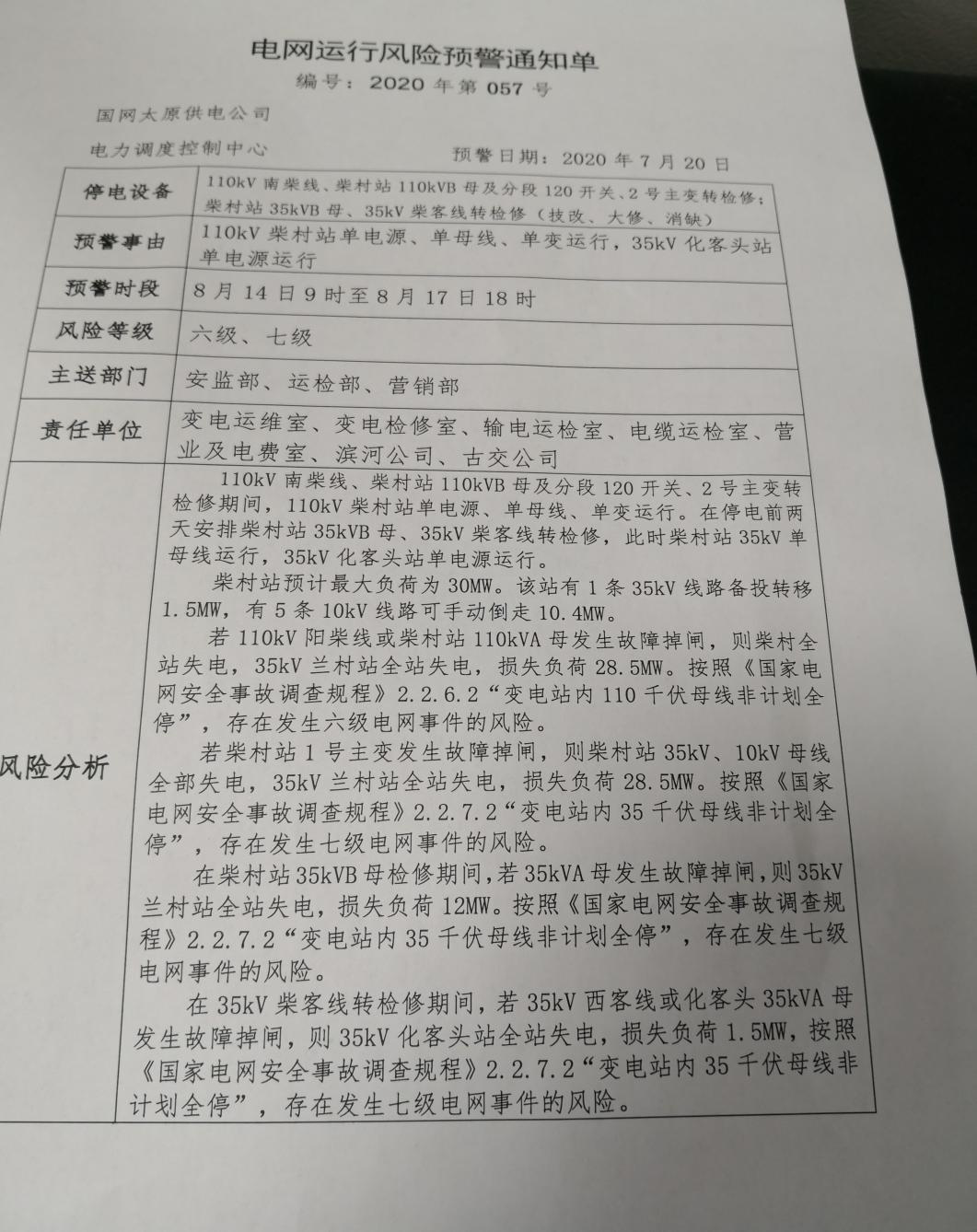 附件:太原供电公司电网运行风险预警通知单