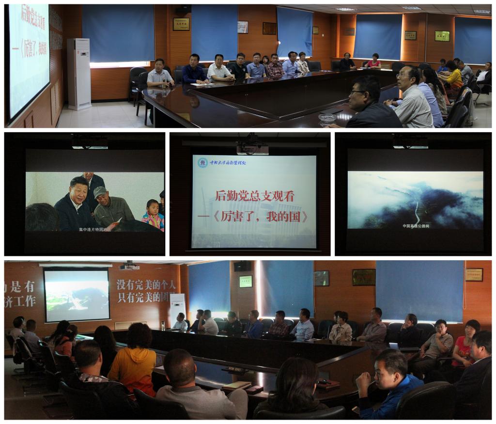 为全面贯彻党的十九大精神,深入学习习近平新时代中国特色社会主义思想,增强广大党员的党性意识和爱国意识,后勤党总支于5月8日上午在后勤管理处办公楼三层会议室组织全体党员干部观看了大型记录影片《厉害了,我的国》。