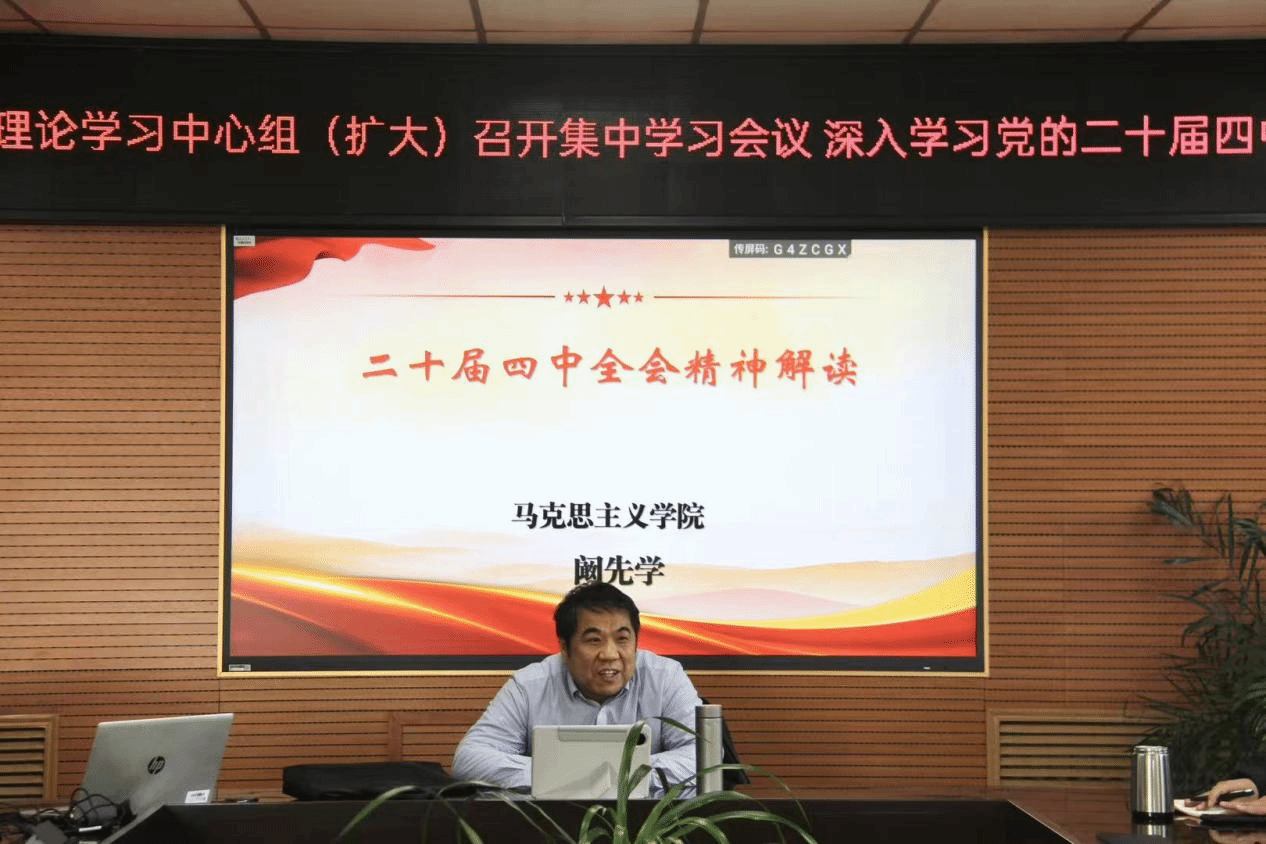 12月19日上午,后勤管理部党总支在三层会议室组织召开党总支理论学习中心组(扩大)集中学习会议,主题为“党的二十届四中全会精神专题学习”。会议由党总支书记杨湖主持,后勤管理部党总支理论学习中心组成员、全体党员及副科级以上干部参加。