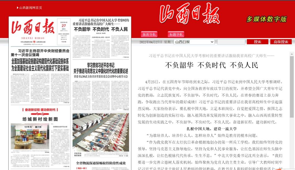 4月25日,在五四青年节即将到来之际,习近平总书记来到中国人民大学考察调研。习近平总书记代表党中央,向全国各族青年致以节日的祝贺,并希望全国广大青年牢记党的教诲,立志民族复兴,不负韶华,不负时代,不负人民,在青春的赛道上奋力奔跑,争取跑出当代青年的最好成绩!习近平总书记的重要讲话在我省高校师生中引起强烈反响,大家纷纷表示,要扎根中国大地,立足本职岗位,自觉把爱国之情、报国之志转化为创新创造的实际行动,融入祖国改革发展的伟大事业之中,融入山西高质量转型发展的生动实践之中,不负韶华,不负时代,不负人民,奋进新征程,建功新时代。