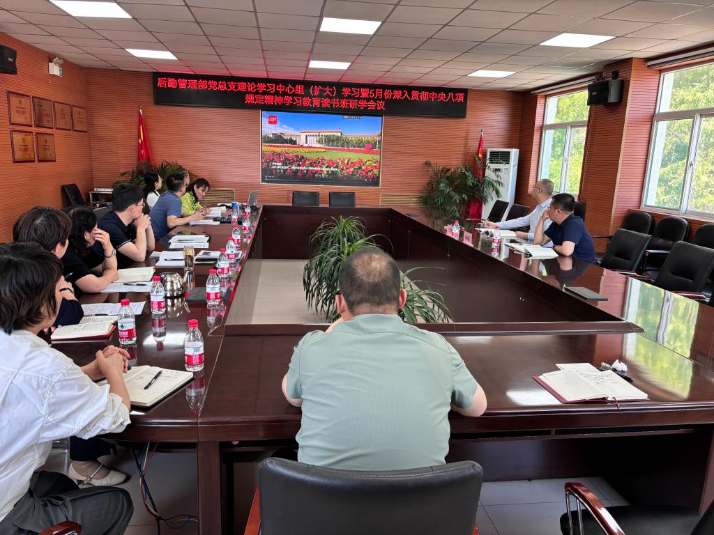 为深入贯彻落实全面从严治党要求,深入贯彻中央八项规定精神学习教育,扎实推进作风建设,后勤管理部党总支于5月17日召开理论学习中心组(扩大)会议暨5月份中央八项规定精神学习教育读书班研学会议。驻校纪检监察组刘国东、兰东明同志莅临督导,后勤管理部领导班子成员、各党支部书记、各党支部委员及党员代表参加会议。会议由党总支书记杨湖主持。