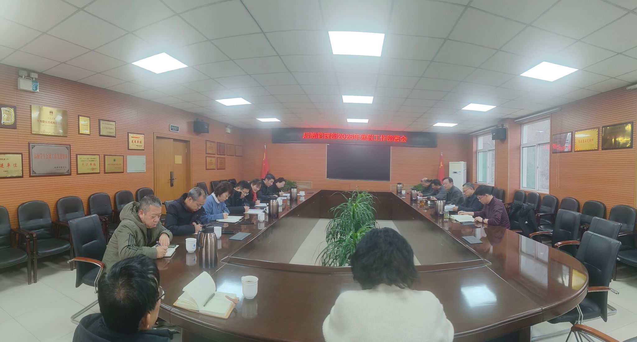 2026年1月30日下午,后勤管理部在办公楼三层会议室召开2026年寒假工作部署会。会议由后勤管理部部长宋睿主持,部领导、各科室负责人参加会议。会议伊始,宋睿部长传达了学校寒假工作部署会的精神,要求各部门严格遵循学校通知要求,扎实做好后勤领域各项工作。随后,各部门负责人依次汇报了假期工作安排,各分管领导就分管领域进行了细致部署,重点围绕食品安全、护林防火、外包范围监管、环卫清运频次、公车管理、水电暖保障、楼宇巡查及费用收缴等关键环节,...