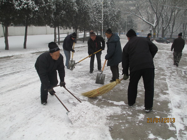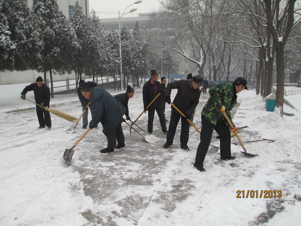 临近放寒假之际,连续两场突如其来的大雪弥漫了整个校园。大雪覆盖了整个世界,到处白茫茫一片,把校园内外装点得如同粉妆玉砌一般。厚厚的积雪和冰层给师生出行带来的极大的困难。1月21日上午8:00,大雪停后,校园环境服务立即组织中心员工成立铲雪小组在主干道进行扫雪、铲雪。