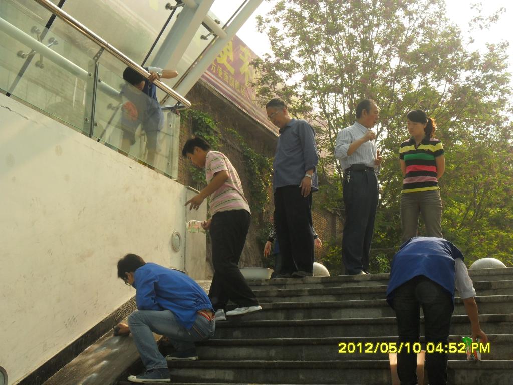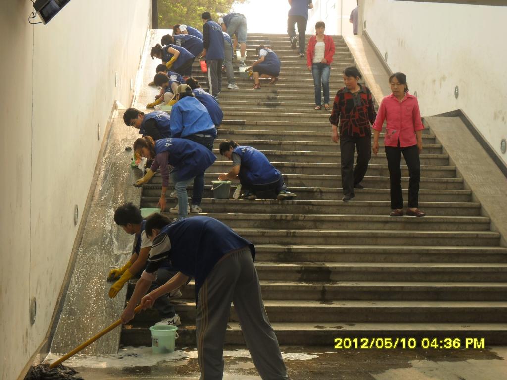在助困办王明丁老师、刘俊贤老师、校园环境服务中心经理徐国平、卫生班组长郭建林的带领下,同学们提着水桶、拿着脸盆抹布钢丝球将地下通道内的台阶、斜坡、玻璃挡板、围墙进行了彻底的打扫与清洗。清洁工作一直从早上八点进行到中午十二点左右,通道内的卫生死角与垃圾等杂物进行了彻底移除。经过一上午的辛苦劳作,地下通道由原来的脏、乱现象变得干净整洁、焕然一新。中北大学东校区地下通道始建于2011年11月,自建成后至今从未进行清理和打扫。通道是东区学生们往返宿舍、食堂和教室的必经之地,每日人流量大,难免产生大量垃圾。尽管校园环境服务中心在通道两侧放置了垃圾桶,但仍然有很多同学缺乏环保意识,随意丢弃塑料袋、废纸等现象持续不断。
