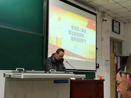 维修组组长贾彪演讲“平凡中见执着,几十年如一日工作在第一线,提出适合教学设备的节能建议。”