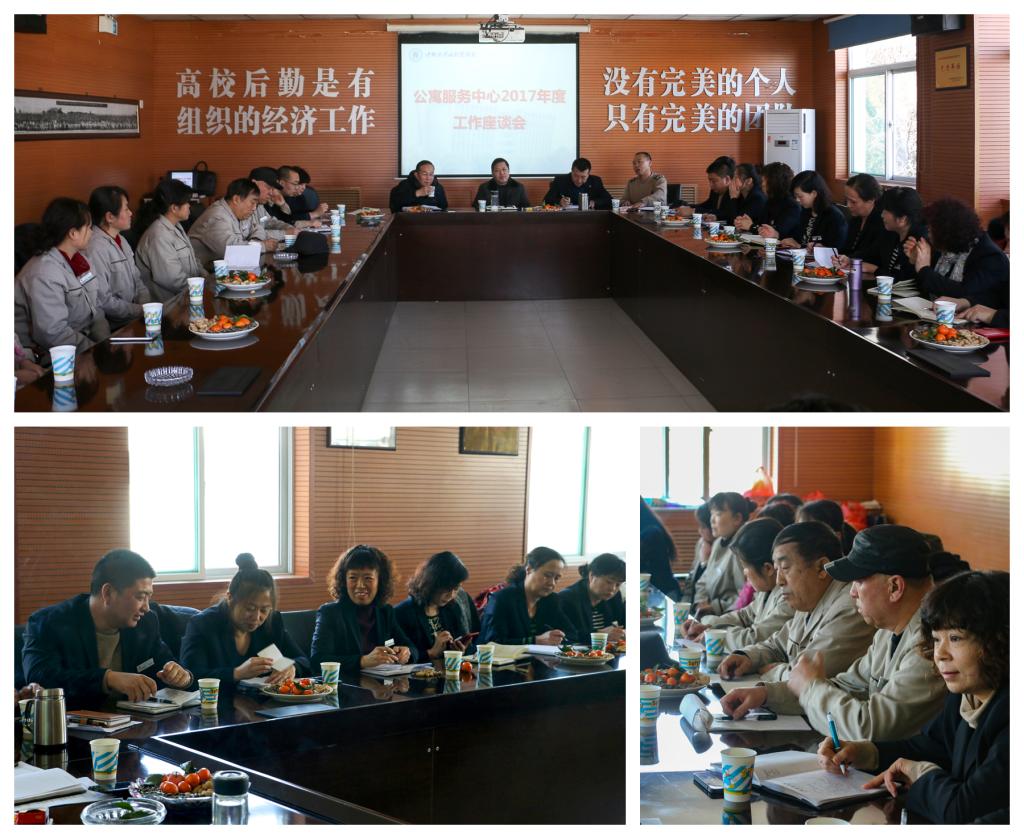 2018年1月17日下午,公寓服务中心2017年度工作座谈会在后勤管理处三层会议室召开。参会人员有:后勤党总支书记白振峰、处长杨正民、副书记陈建富,以及公寓服务中心主任张岐山、副主任尹国华和相关职工。