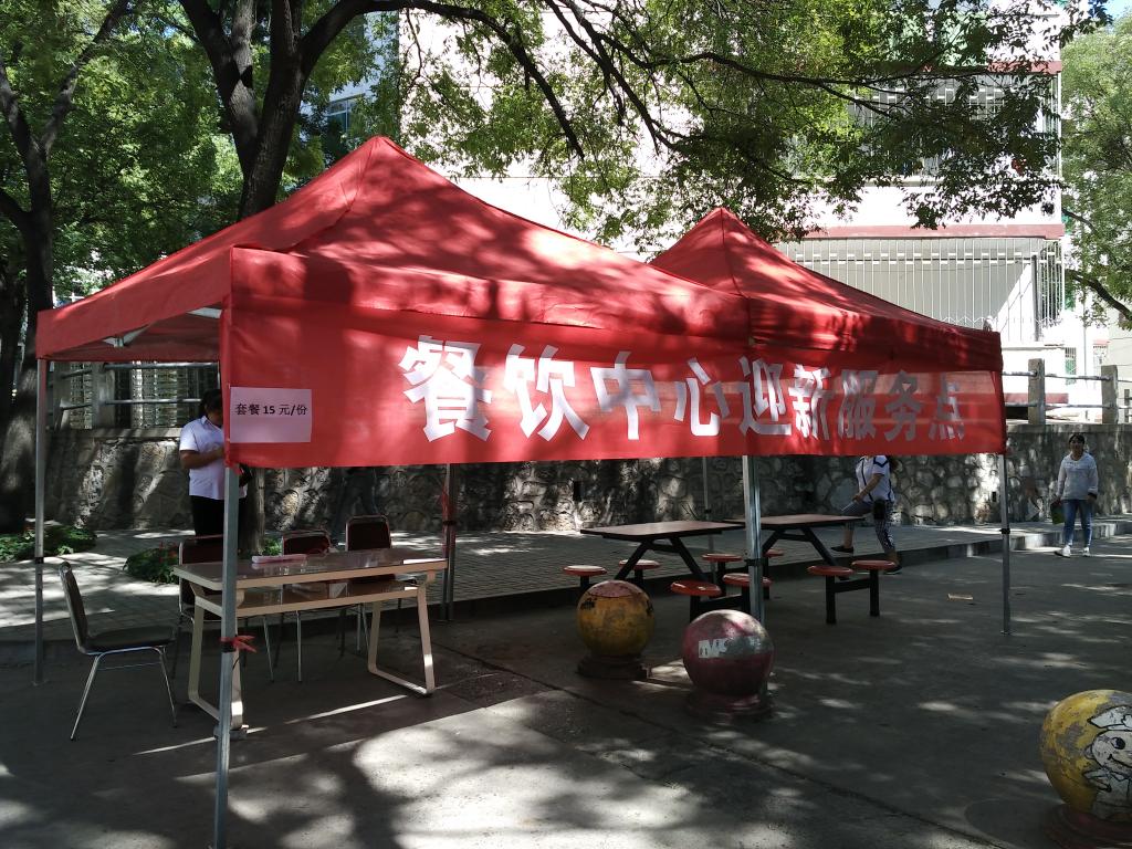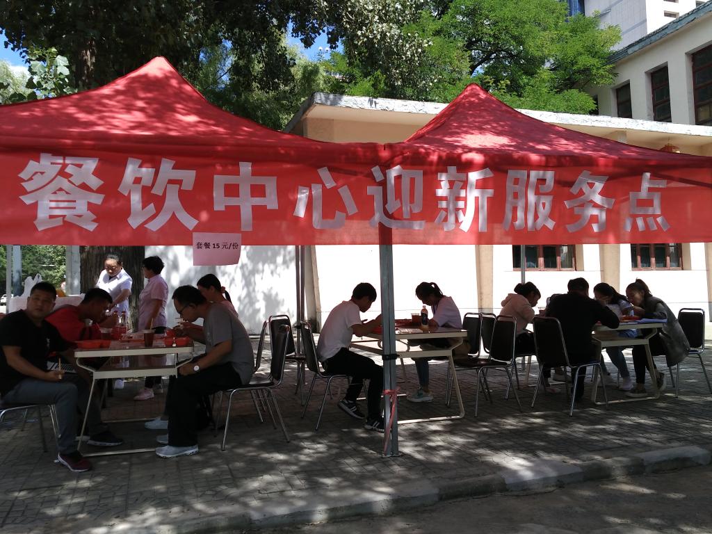 为了缓解迎新期间食堂就餐压力,同时方便广大新生及家长,餐饮服务中心特组织人员和设施在西区二道门口和东区一号教学楼楼下,设置了迎新临时售饭点。售饭点出售的盒饭为两荤一素一米一汤、每份15元的套餐,切实保障新生及家长的方便就餐。