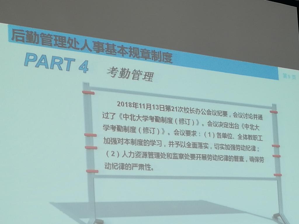 培训开始,谢荣芳科长通过PPT图文并茂地给大家讲解了人力资源基本规章制度,包括员工聘用管理、入职管理、考核和奖励、离职管理,重点学习了学校考勤管理制度,包括劳动纪律、考勤考核、请销假规定。