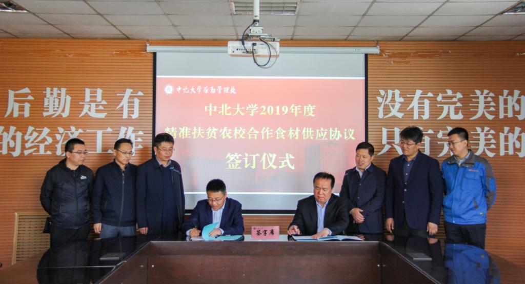 为贯彻落实党和国家对精准扶贫工作的相关要求,积极推进对口扶贫县五寨县的经济发展和产业结构完善,我校驻五寨县东秀庄乡工作队经过深入调研、考察分析及多方协调,结合我校自身优势和食材需求,利用五寨县国家农村产业融合发展示范园项目建设契机,以五寨县东秀庄乡、五寨县绿谷农业科技有限公司、中北大学签订的三方帮扶协议为基础,与五寨县绿谷农业科技有限公司签订了精准扶贫农校合作食材供应协议,并举办了签约仪式。出席签约仪式有中北大学党委组织部部长贾献忠、后勤管理处处长杨正民、五寨县绿谷农业科技有限公司贾峰清总经理、中北大学东秀庄乡扶贫工作队新老队长及后勤管理处相关人员,签订仪式在祥和的气氛中进行完毕!