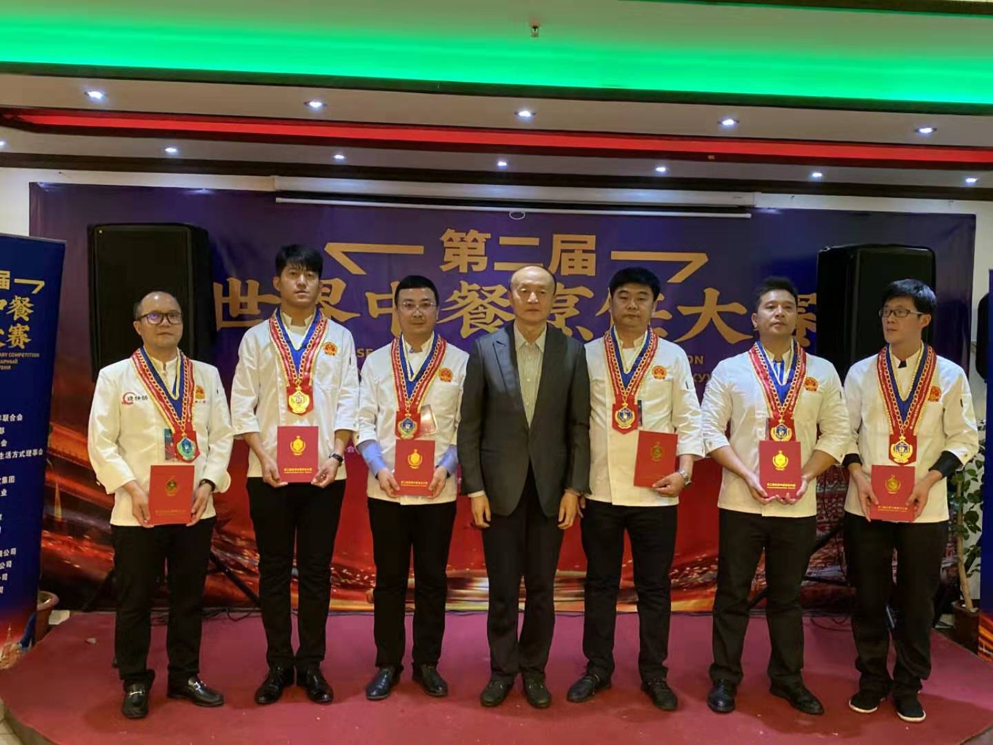 我校张耀德荣获大赛最高奖——五星钻石奖并被授予“世界中餐推广大使”(左三)