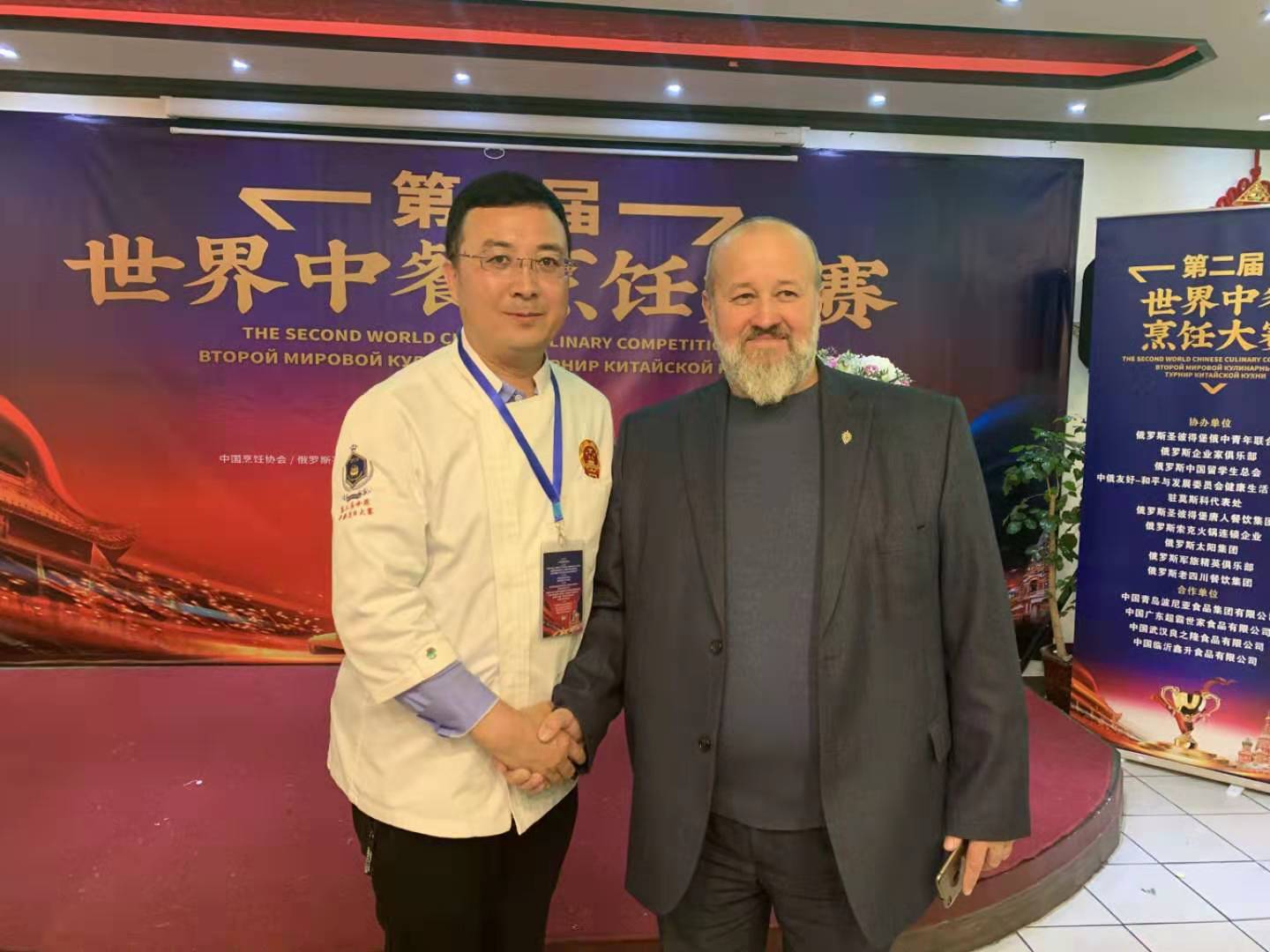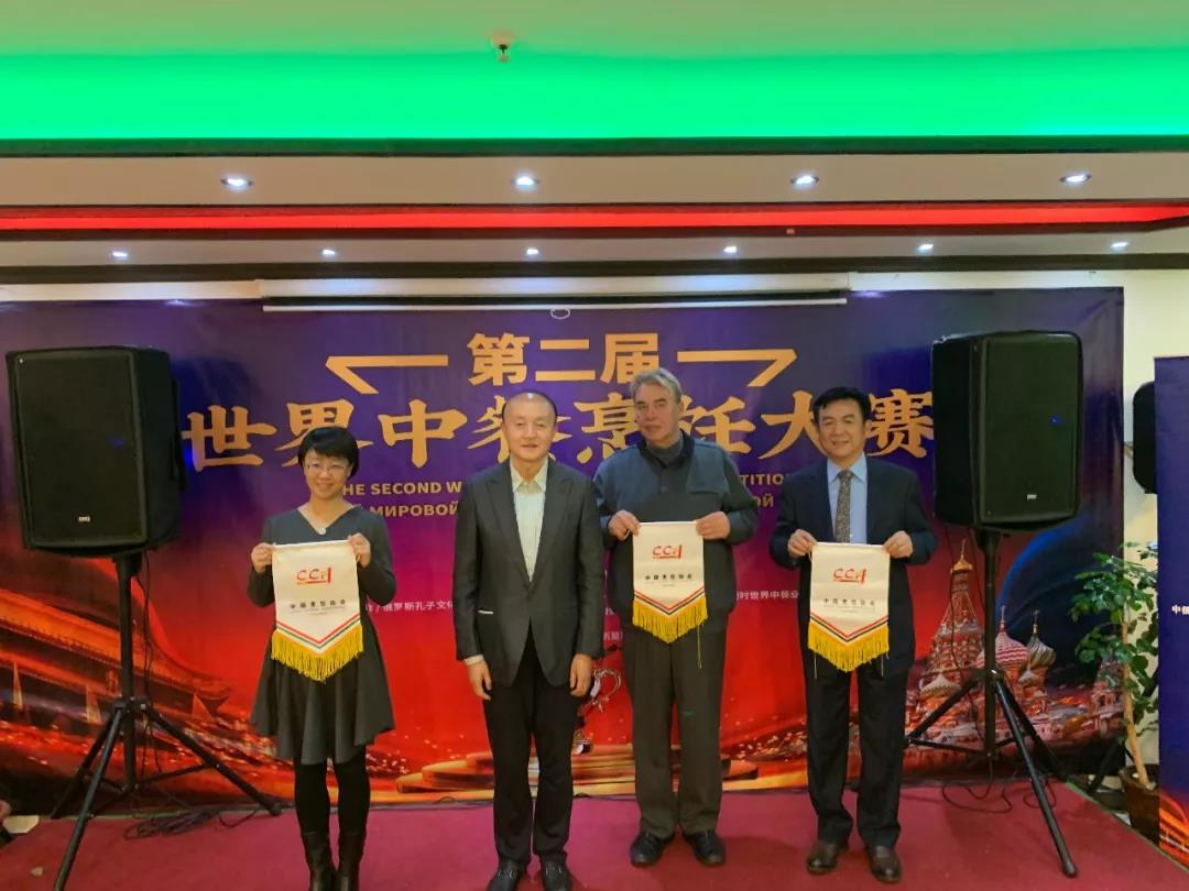 向中国驻俄罗斯大使馆、莫斯科市政府、俄罗斯孔子文化促进会赠送中国烹饪协会会旗