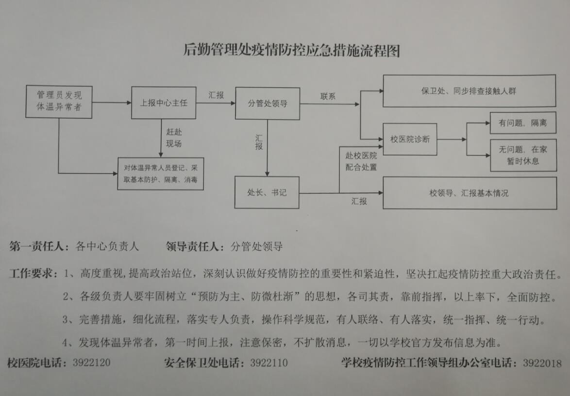 新冠肺炎疫情发生后,按照学校的指示,后勤管理处迅速组建成立疫情防控领导小组,起草制定疫情防控应急工作预案,召开专门会议部署后勤各部门疫情防控工作,逐条梳理各部门疫情防控措施,明确了疫情防控期间的操作要求以及疫情处置流程。