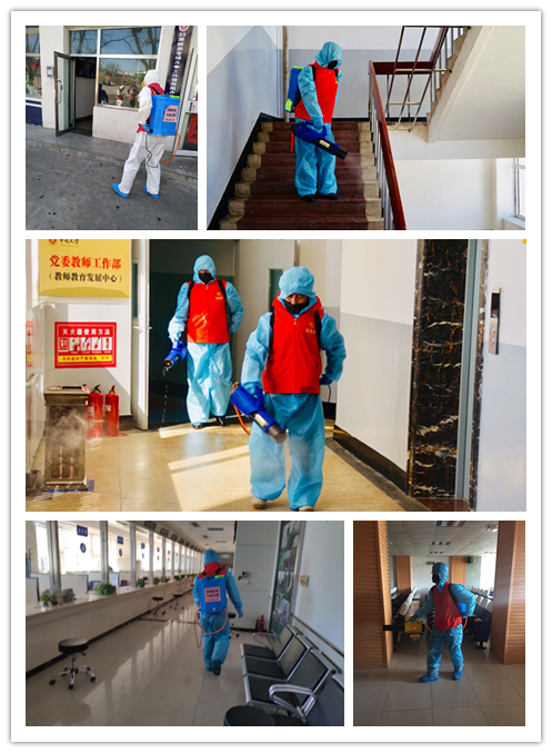 在防疫消毒现场,保洁人员身着专业的防护装备,肩负30多斤的喷雾器,对办公场所、实验室、教研室等公共场所逐一实施消毒防疫,并重点对楼道、洗手间等关键区域实施密集消毒。下一步学生返校前,此项活动还将进一步深入完成对食堂、教室、宿舍等师生集聚场所的全面消杀工作,切实做好开学前的一切准备。
