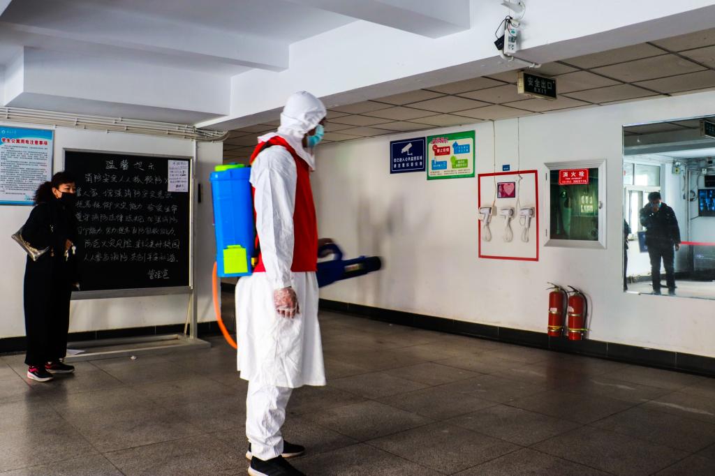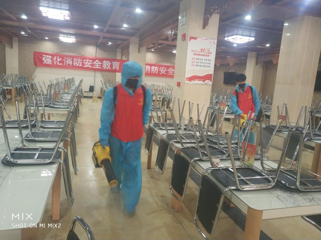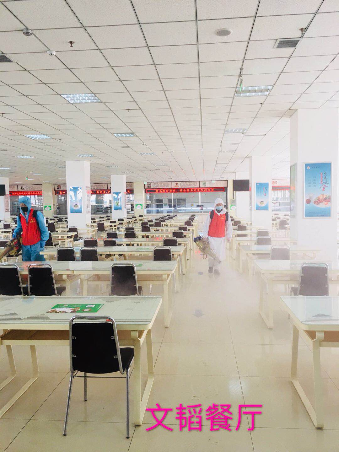 在我校后勤保障组的密切配合和统筹安排下,消毒工作队进入校园后,穿上防护服,配置药水,手持迷雾机,采用“地毯式”消杀方式,对我校学生公寓、食堂的公共区域进行全面消杀,对楼梯楼道、盥洗间、厕所、学生辅导员办公室、学生活动场所等关键部位进行密集消毒作业。经过一上午的辛勤劳动,31栋公寓楼、3个食堂的消杀工作全部完成。