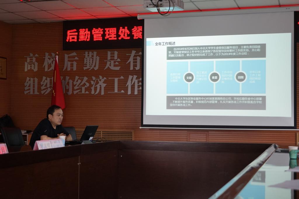 首先,赵剑川主任介绍了我校东、西区各个食堂保洁外包工作的基本情况,并宣读了这次食堂保洁服务考核的标准。山西仁慧劳务有限公司的负责人、太原保城物业管理有限公司的负责人,先后做了2019—2020年度的工作汇报,表述了一年以来的服务业绩、罗列了今后的工作计划,并反馈了一些工作中需要餐饮服务中心配合解决的问题。随后,考核组对以上两家物业保洁公司的工作进行了评议。