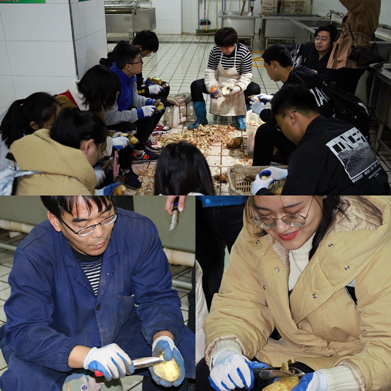 随后,同学们开始了帮厨实践,体验削土豆这一过程,食堂师傅认真教授同学们如何快速高效地完成任务。师傅熟练的刀工,飞快的速度令同学们连连惊叹。做好安全防护后,同学们迫不及待地加入到这一环节并虚心向食堂师傅请教,努力做到又快又好,力争上游。