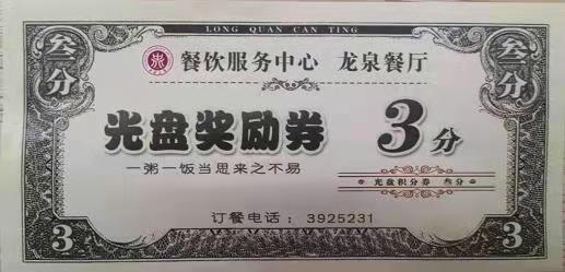 为深入贯彻落实习近平总书记关于制止餐饮浪费行为的重要指示精神,培养学生良好的健康饮食习惯,提高学生爱粮节粮的意识,弘扬勤俭节约的传统美德,引领节约用餐良好风尚,杜绝舌尖上的浪费,餐饮服务中心龙泉餐厅以“爱粮节粮”为主题推出光盘奖励积分券活动,内容如下: