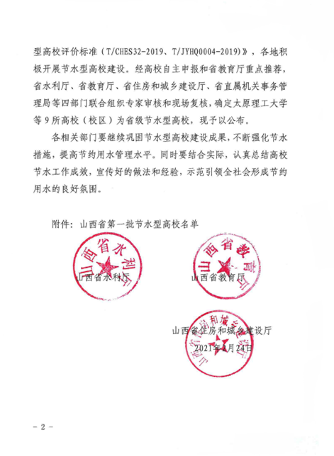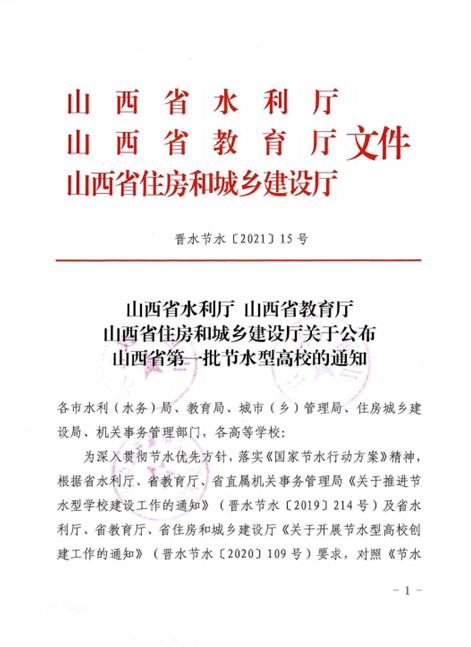 栉风沐雨奋进路,同舟共济再扬帆。此次成功入选“山西省第一批节水型高校”,既是对我校日常用水管理、节水思路和措施等方面的肯定,也为以后我校节水工作提出了更高要求。下一步,我校将在节能工作上继续发力,不断推进机构节能工作和绿色校园建设,持续提高我校能源管理水平。