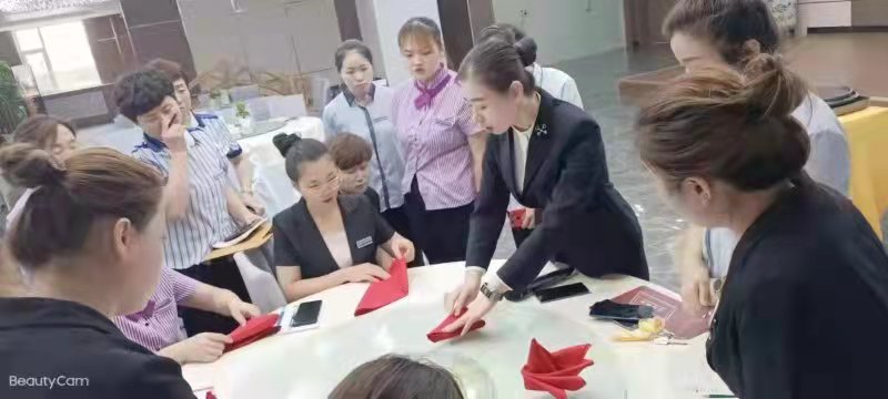 此次培训内容分为酒店礼仪礼节规范和餐厅六大服务技能(托盘、铺台布及摆台、餐巾折花、斟酒、上菜、分菜)两大板块。培训课上,武老师以丰富的实践经验让员工感受到微笑服务的重要性,并以微笑、眼神以及身体语言的礼仪魅力,娓娓地讲述了服务人员如何塑造良好职业形象。通过讲解,让员工更好理解并掌握对客服务礼仪。