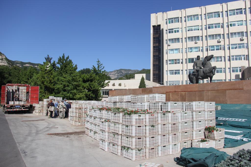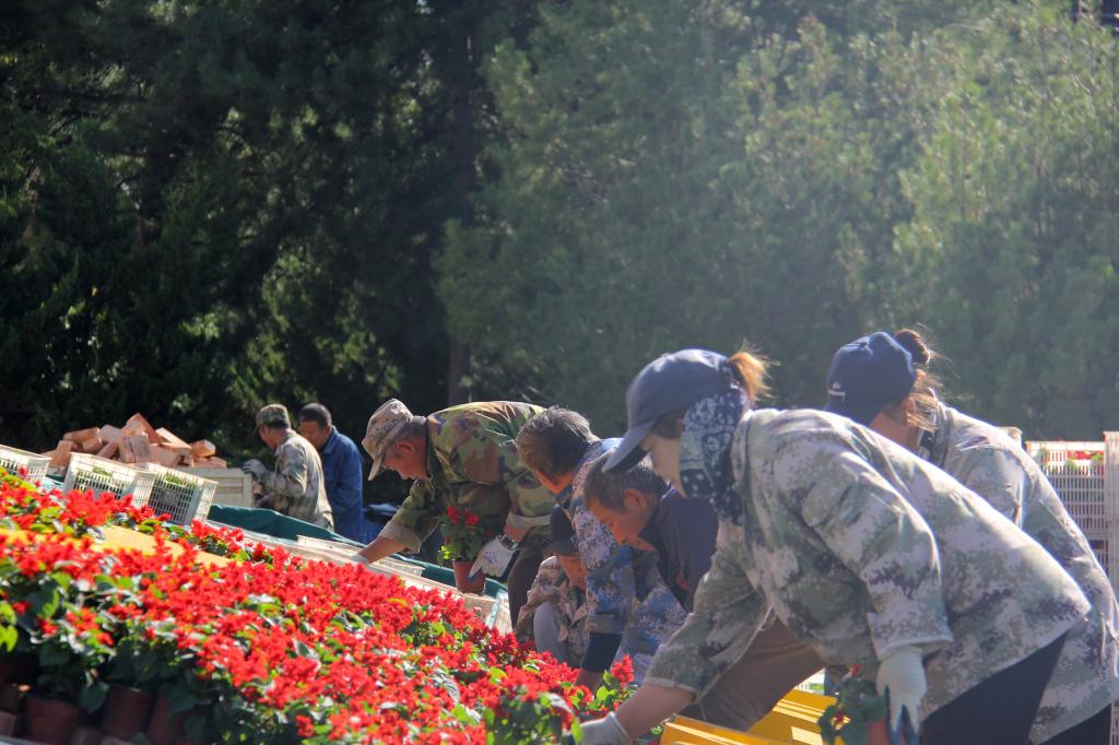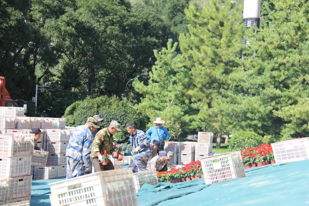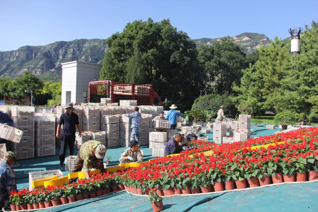 本次立体花坛建设时间紧、任务重,制作过程中还要考虑到环境、气候等多重因素,采用了时令花卉和特色植物搭配,使整个花坛层次丰富,视觉效果更加饱满。立体花坛长31米、高5米、宽10米,以党徽为主景,由串串红、茉莉花、秋菊花、满天星组合而成,并组成两条鲜花彩带,同时搭配铁树、变叶木等特色植物组成两个车轮,整个花坛景观协调、自然,充满昂扬奋进的勃勃生机,花坛的布置从前期的规划设计到后期的摆放完成均由校园绿化中心自行设计,校园绿化中心全体员工加班加点,仅用两天时间将29000余盆花全部布置完毕。