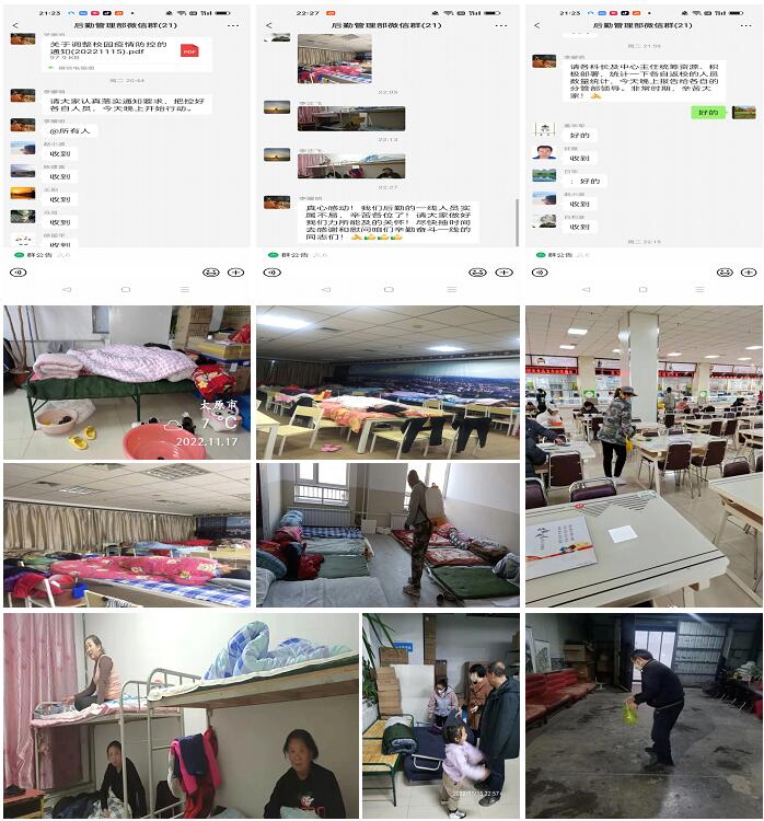 当天晚上,各部门随即组织后勤一线人员紧急返岗并上报返岗人数,所有返岗人员全体住校,积极响应学校号召,服从工作安排,主动克服家庭困难,有的甚至连夜带上孩子一起到校,有的晚上十一点多还在搭床板,住的地方不够,住宿条件不好,大家就主动打地铺,各部门安排专人对员工住宿地方进行全面消毒工作,保证大家居住安全。