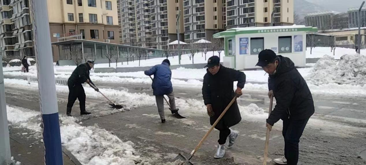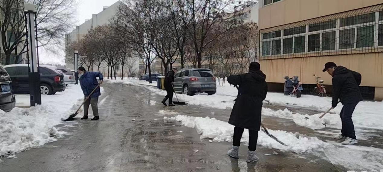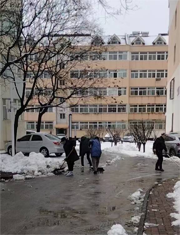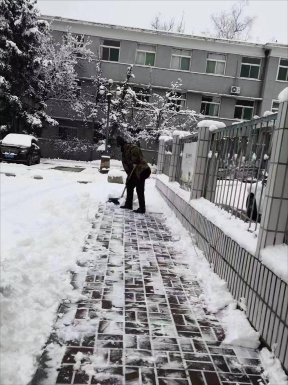 最美下雪天,最暖扫雪人。中心员工不畏严寒铲除积雪、清扫路面,校园处处留下了他们顶风冒雪、甘为奉献的身影。虽然室外气温很低,寒风刺骨,但他们们干劲十足,挥动铁锨、雪铲,齐心协力、配合默契,有的铲、有的推,干得热火朝天。经过数小时的紧张劳动,校园主干道路上的积雪被基本清除,堆满厚厚积雪的道路变身为方便行人和车辆通行的“安全通道”。