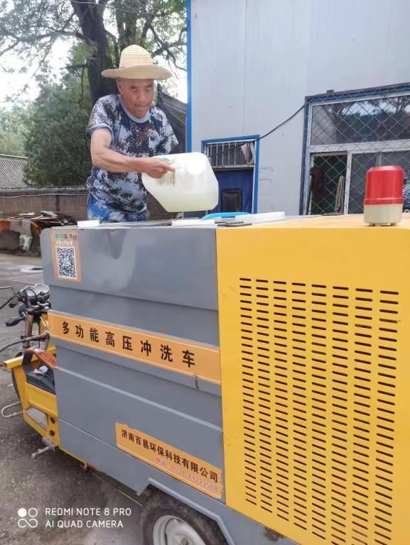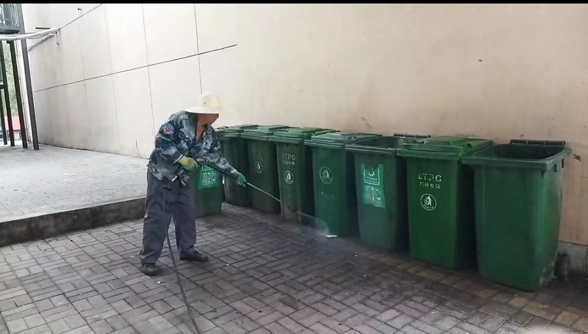 清洗现场,工作人员用高压水枪把垃圾桶内外及底部进行彻底冲洗干净,并喷洒消毒液,对垃圾桶进行消毒作业。作业结束后,垃圾桶定位设置,摆放整齐有序,垃圾桶周边无散落存留垃圾和污物,外体干净,无异味。