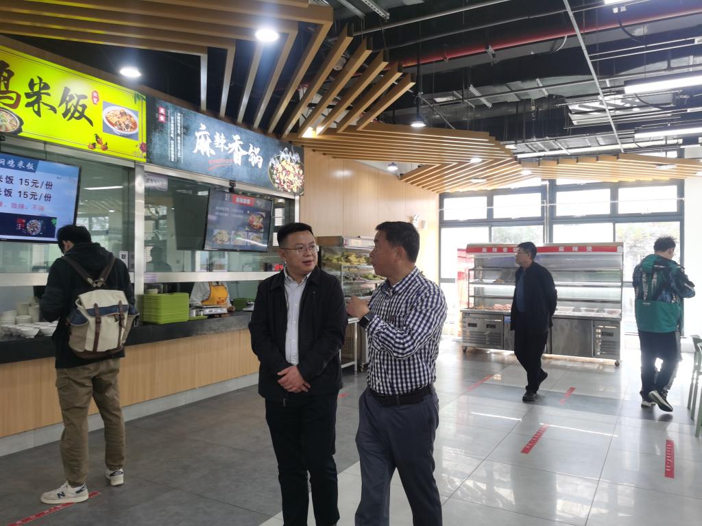 第二站:南京理工大学江阴校区,校区龚建龙副校长详细介绍了校区的规划、运行及社会化情况,并带领大家参观了整个校区环境及学生餐厅。