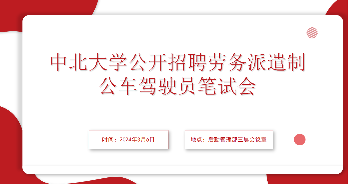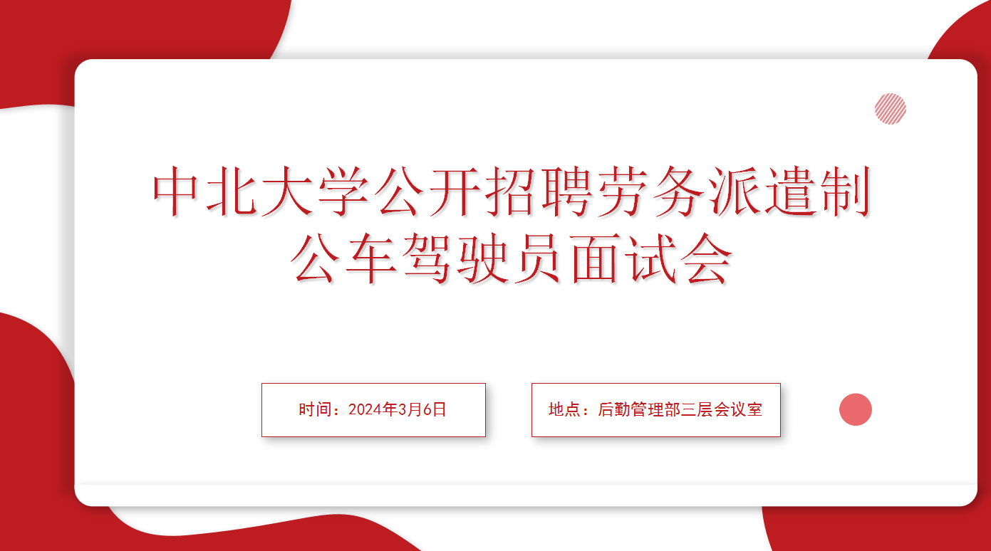 2024年3月6日,根据我校招聘工作安排,后勤管理部组织召开“中北大学公开招聘劳务派遣制公车驾驶员招聘会”,学校办公室、宣传部、人力资源部、后勤管理部代表、外聘专家担任评委,会议由车辆管理科科长王芳主持。