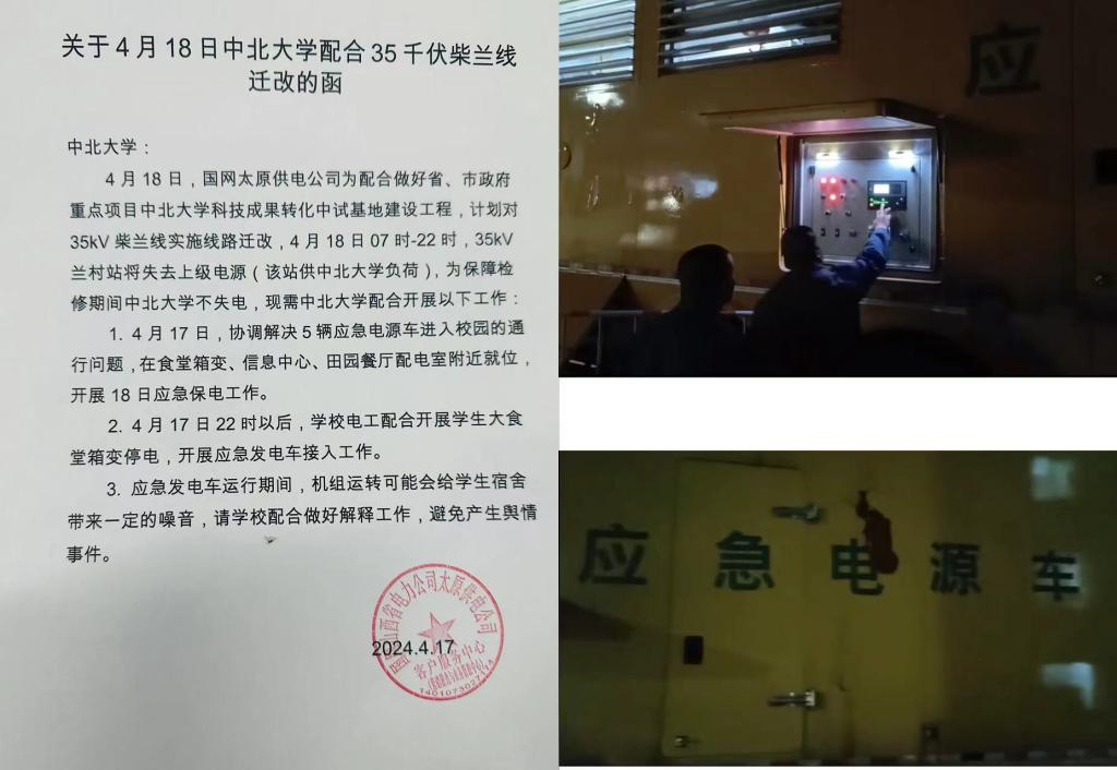 为尽量减少对全校教学科研影响,保障检修期间中北大学全校用电,后勤管理部与供电公司多次协商,最终敲定在夜间进行停电送电操作,并协调供电局提供5辆应急电源车进入校园,保障食堂、信息中心、田园餐厅等重点部门应急发电。