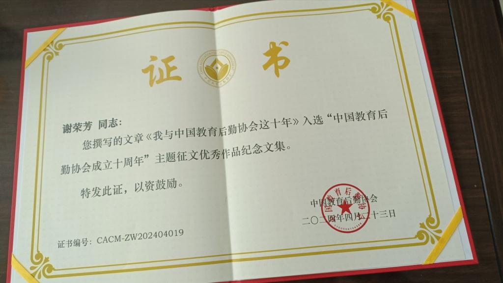特别值得一提的是,我校后勤管理部的谢荣芳老师更是以其文章《我与中国后勤教育协会这十年》在“中国教育后勤协会成立十周年”主题征文活动中脱颖而出,被评选为优秀作品。这一殊荣不仅是对谢老师个人的肯定,更是对我校后勤管理工作的认可与鼓励。