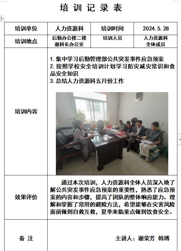 2024年5月28日上午,人力资源科在二楼办公室召开了5月份安全培训及工作会议。会议开始,安全员韩博带领大家集中学习后勤管理部公共突发事件应急预案,接着谢科长给大家讲解防灾减灾和食品安全方面相关知识。最后,每个人回顾并总结五月份工作。