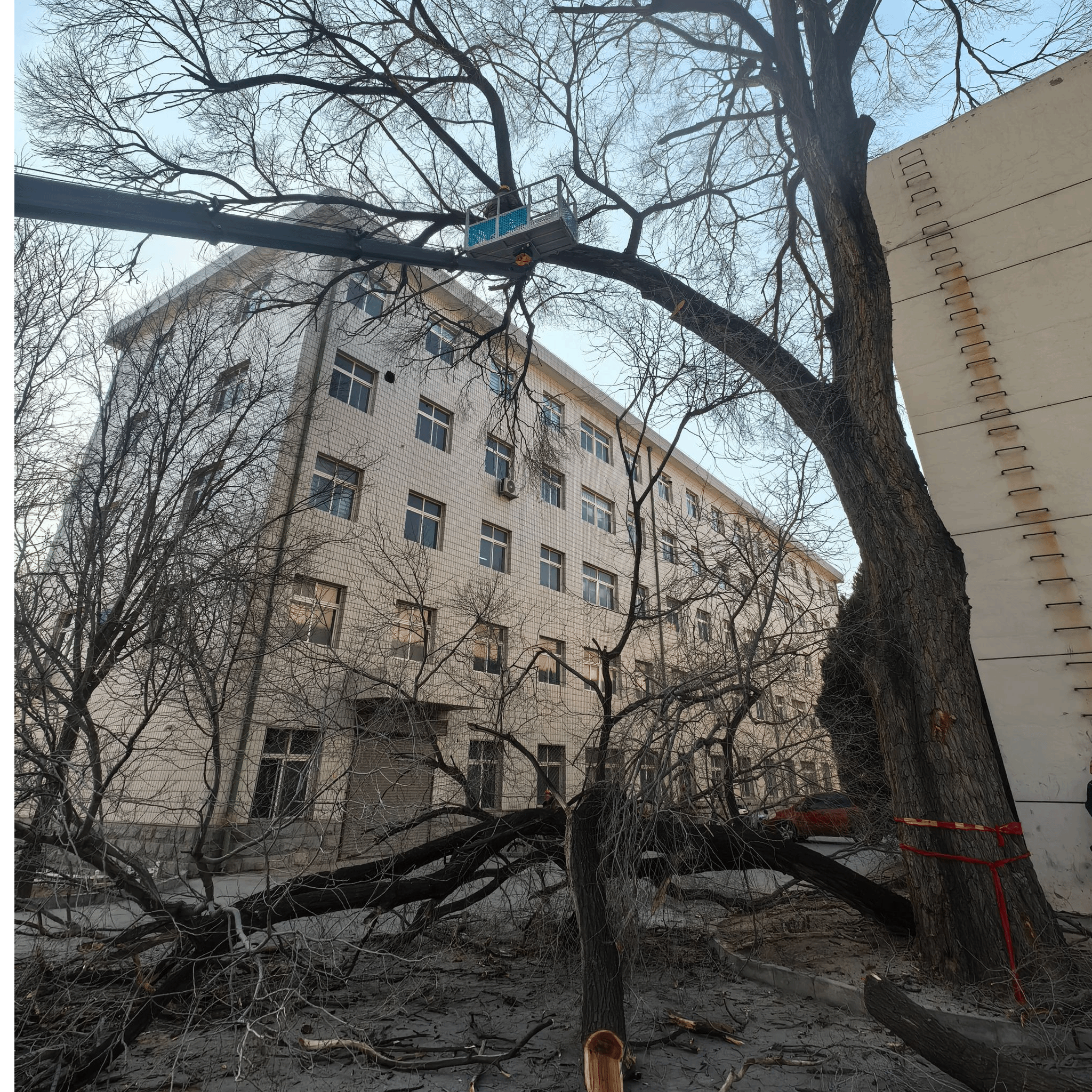 在高风险、高强度作业下,工作人员不畏艰险、连续奋战,彻底消除坠枝隐患,让校园林木整齐美观、环境焕然一新。