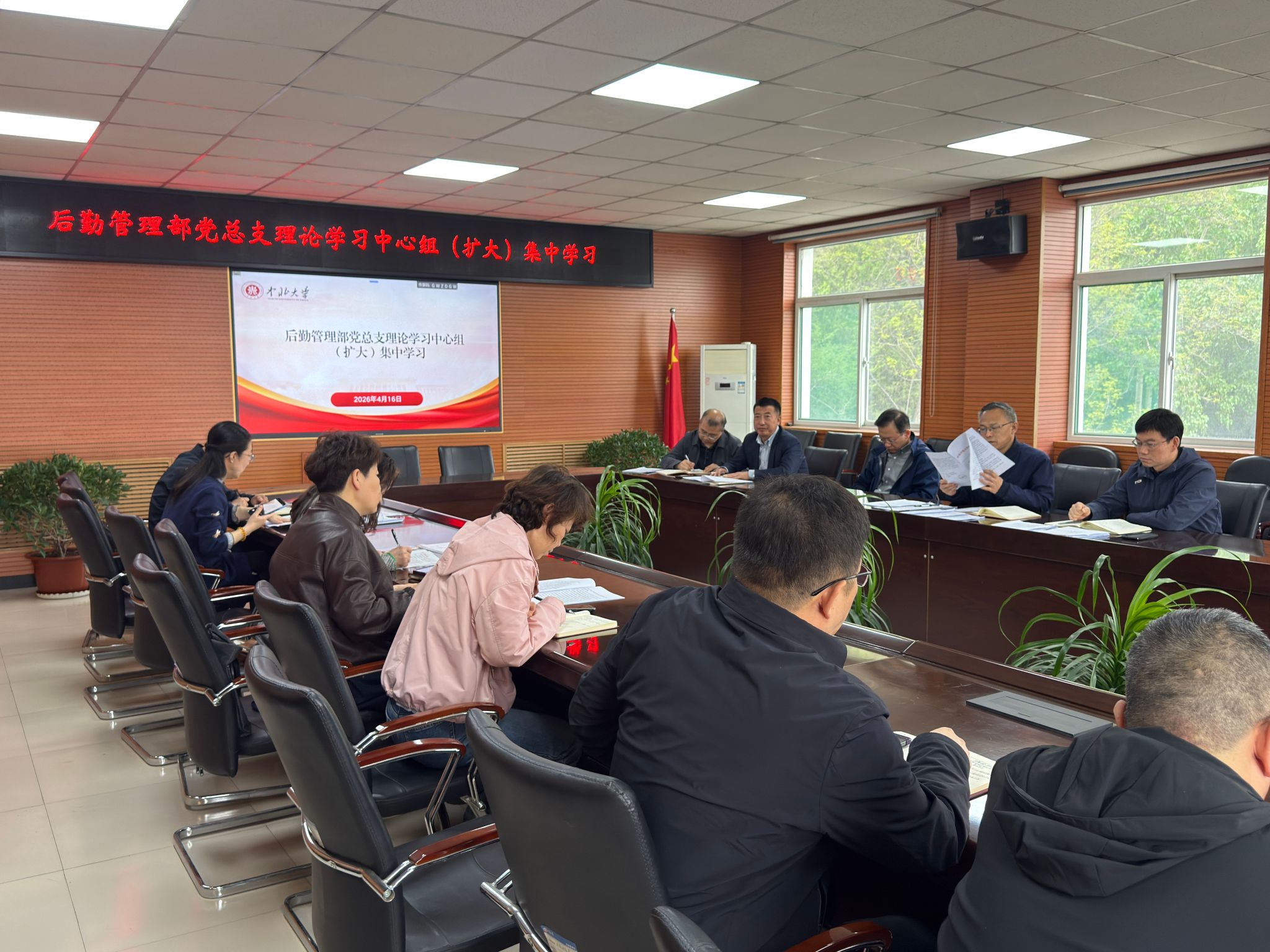 4月16日上午,后勤管理部党总支理论学习中心组(扩大)在后勤管理部三层会议室举行集中学习。党总支书记杨湖主持会议并领学相关内容,部领导班子成员及各科室负责人参加学习。